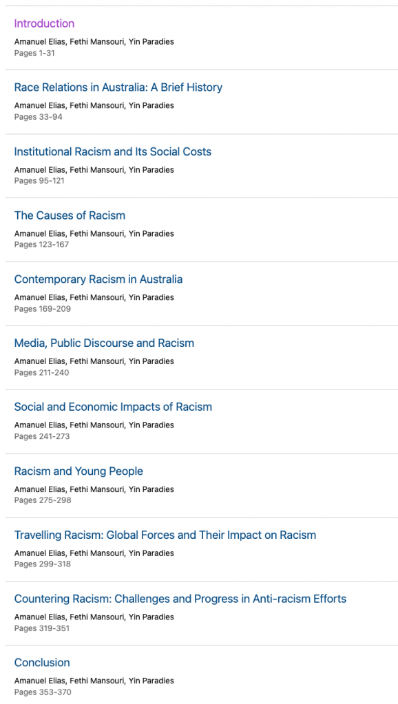 Elias A, Mansouri F, Paradies Y. Racism in Australia Today. Springer Singapore. 2021.