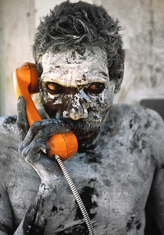 Tom Noytuna using a newly installed telephone in Arnhem Land, Australia, photo Penny Tweedie